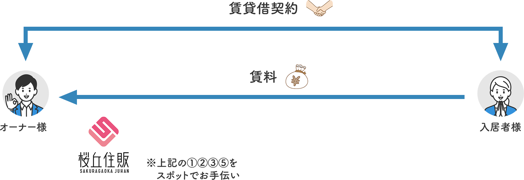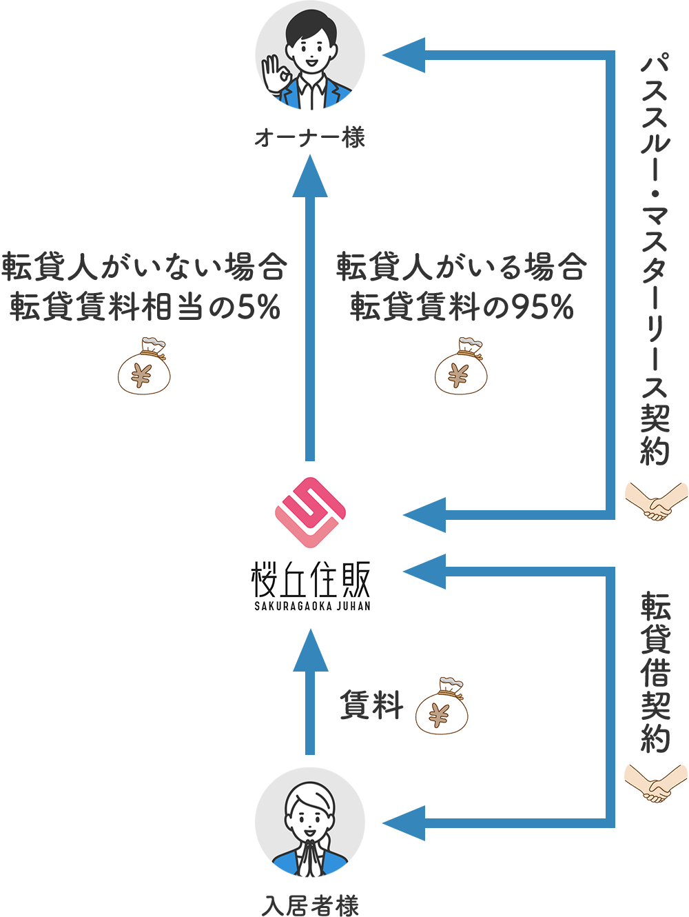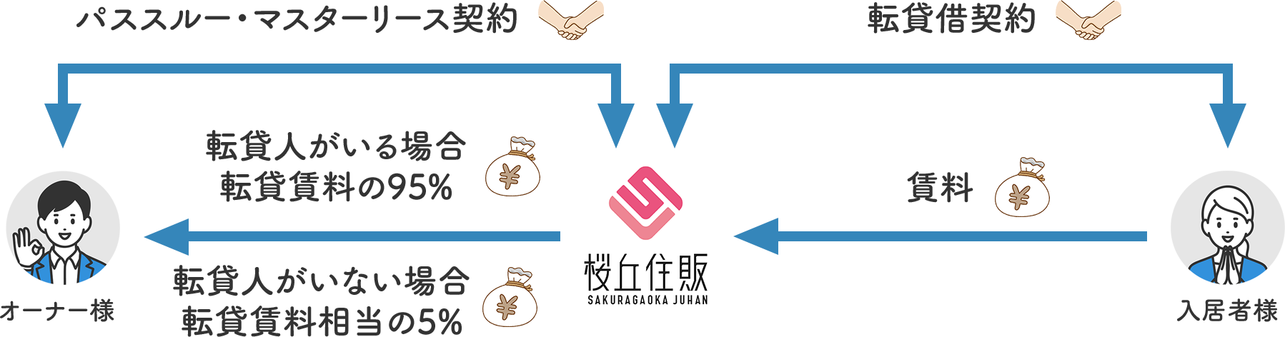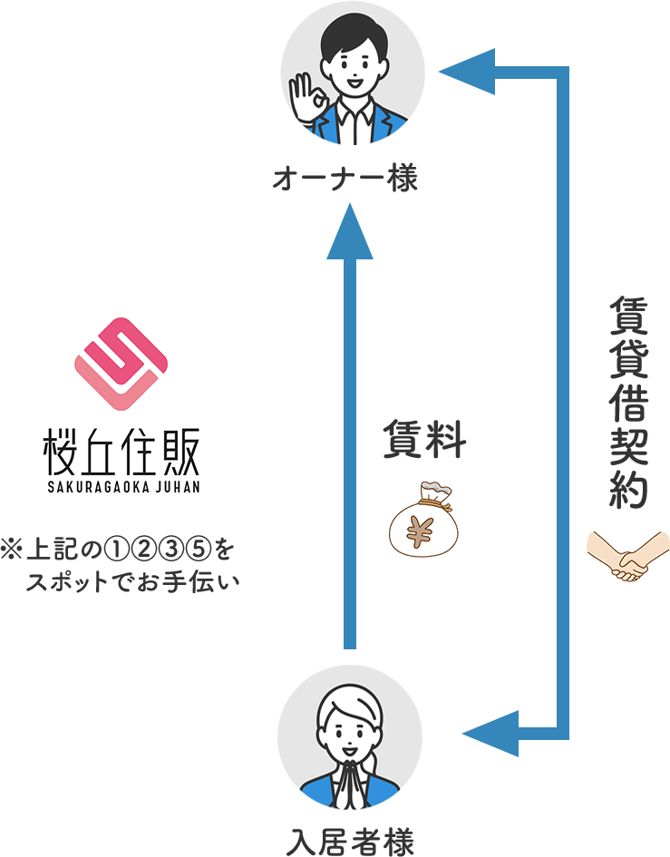 賃貸管理業務をすべて行い、転貸人がいる場合は転貸賃料の95%、いない場合は5%を桜丘住販から毎月お支払いいたします。