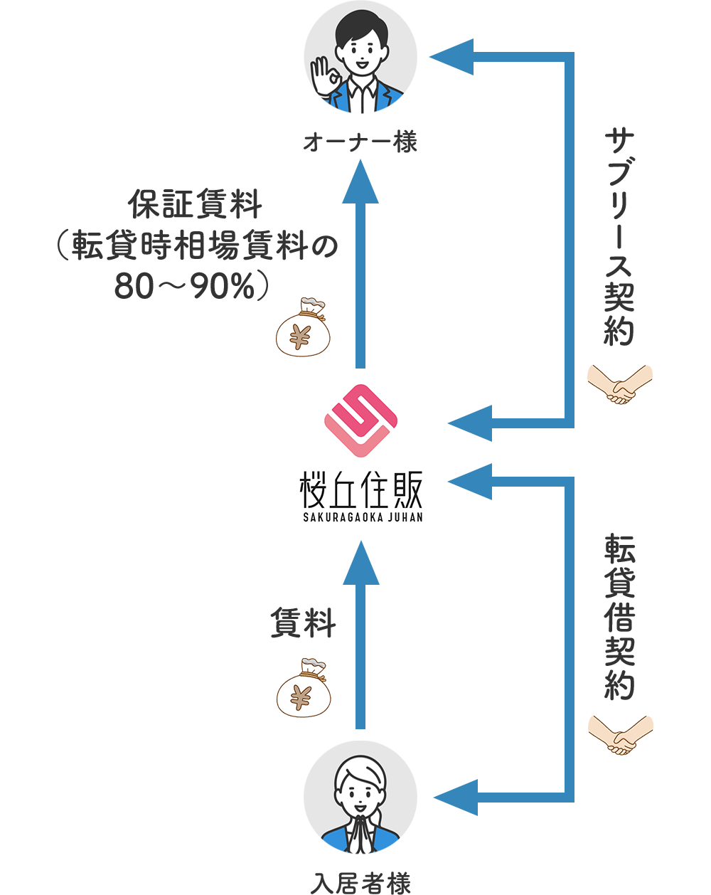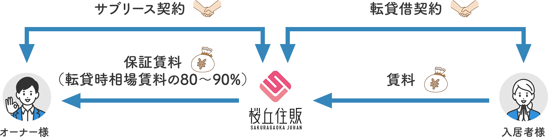 賃貸管理業務をすべて行い、転貸時相場賃料の80%〜90%を必ず桜丘住販からお支払いいたします。